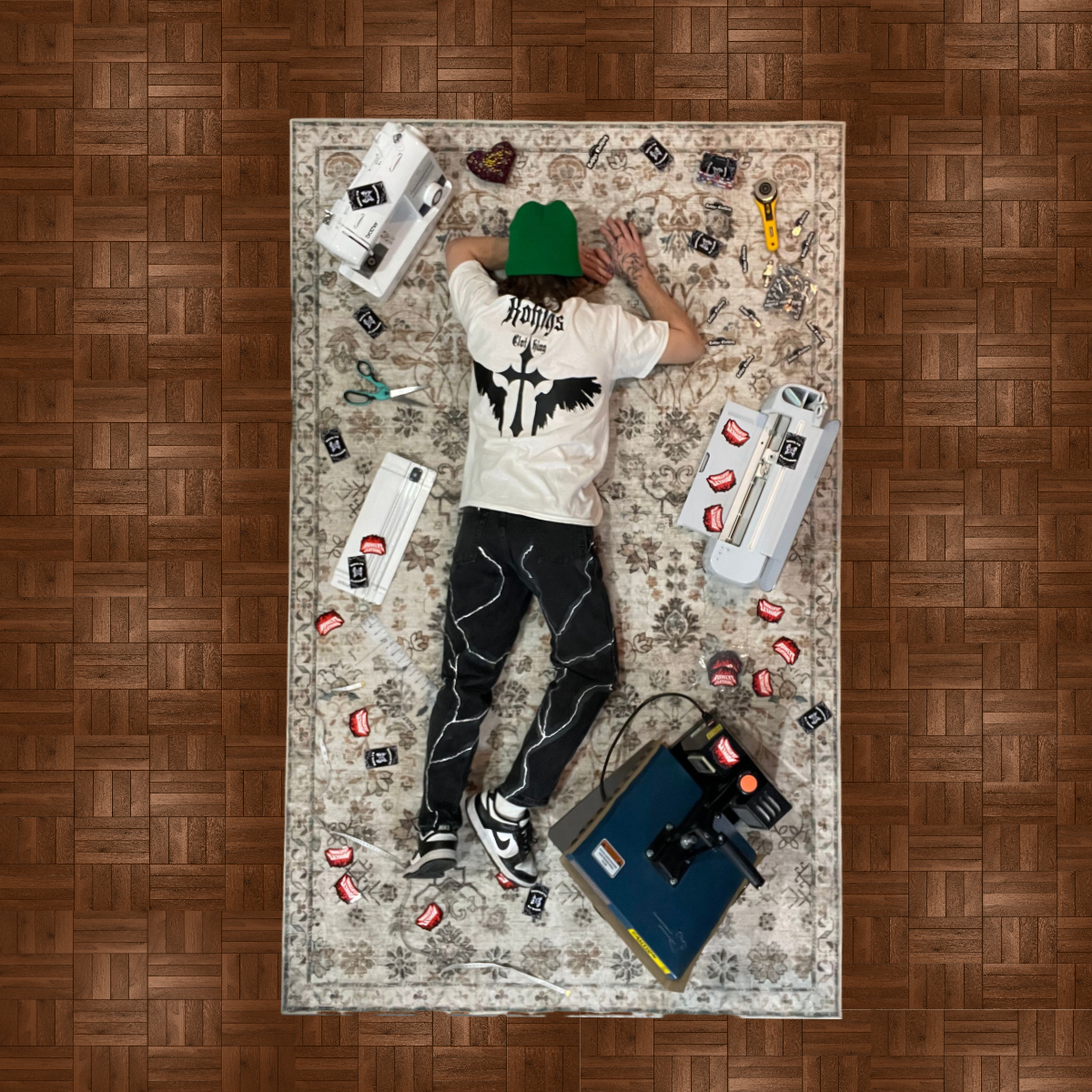 I release collections of clothes sparked from events or personal experiences that I feel others experienced and I create all my designs and make it into a collection of clothing. The process involves me using a Cricut machine to cut out my designs and a heat press to transfer the design to the garment. As for my 1 of 1s I repurpose carefully picked thrifted clothing that I feel has potential to make into something unique and cool.